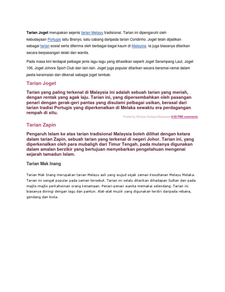 Keunikan dalam setiap persembahan tarian ngajat inilah menjadikan suku kaum ini terlalu istimewa dan tersendiri. Tarian Zapin yang mengangkat dipersembahkan menerusi kebudayaan itu telah WIKIPEDIA iringan petikan gambus menghimpunkan lebih serta taksim di samping 20000 pengamal zapin telangkah gendang marwas yang terdiri dari kalangan yang memberi tenaga warga tua dewasa kepada muzik yang remaja dan kanak-kanak. Alat muzik yang biasa digunakan dalam tarian joget adalah gendang biola dan rebana.
